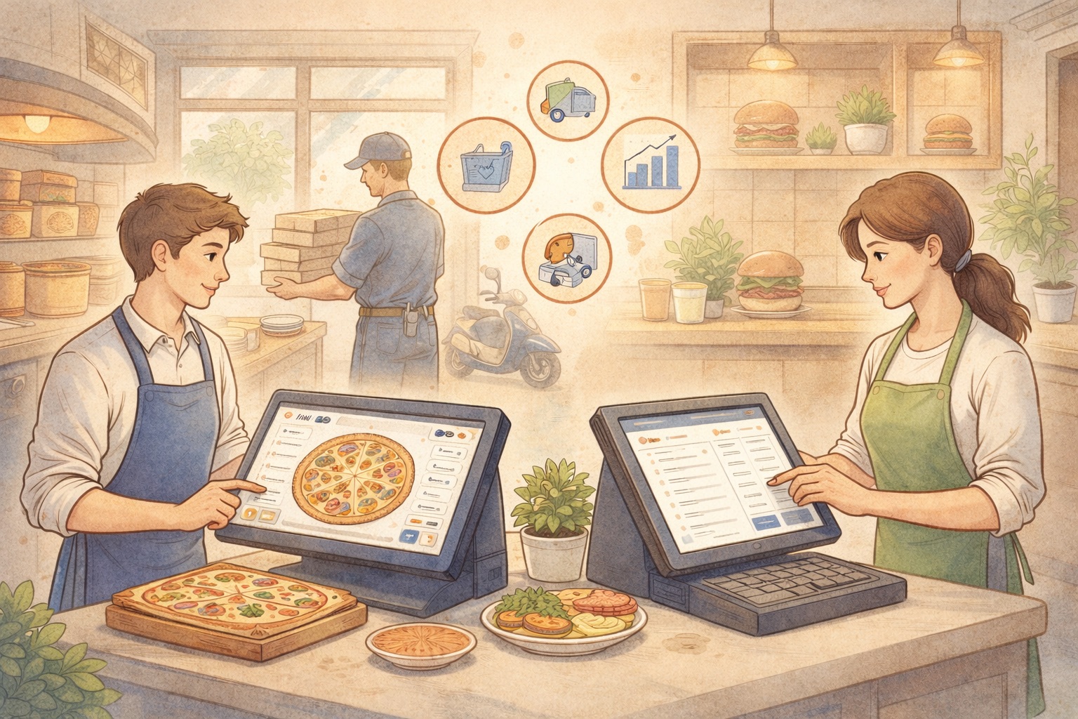 A modern pizzeria POS supports: